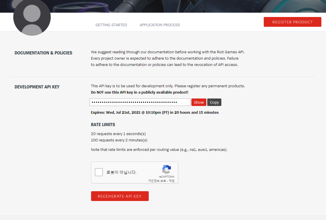 우측 상단에 Register Product를 클릭하고 Personal API Key를 신청하면 Riot에서 확인하고 제공해준다.