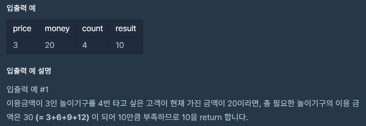 새로 생긴 놀이기구는 인기가 매우 많아 줄이 끊이질 않습니다. 이 놀이기구의 원래 이용료는 price원 인데, 놀이기구를 N 번 째 이용한다면 원래 이용료의 N배를 받기로 하였습니다. 즉, 처음 이용료가 100이었다면 2번째에는 200, 3번째에는 300으로 요금이 인상됩니다. 놀이기구를 count번 타게 되면 현재 자신이 가지고 있는 금액에서 얼마가 모자라는지를 return 하도록 solution 함수를 완성하세요. 단, 금액이 부족하지 않으면 0을 return 하세요.