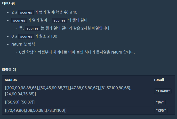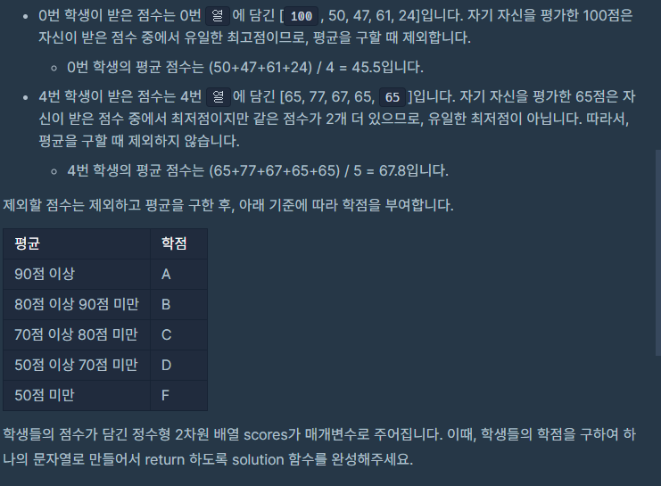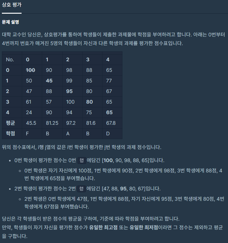 간단하게 이야기하면 각자 모두에게 평가를 한다. 그리고 자기가 받은 점수 중에 스스로 평가한 점수가 유일한 최고점이거나 최저점일 경우 그 값을 빼고 평균을 내어 성적을 출력한다는 내용이다.