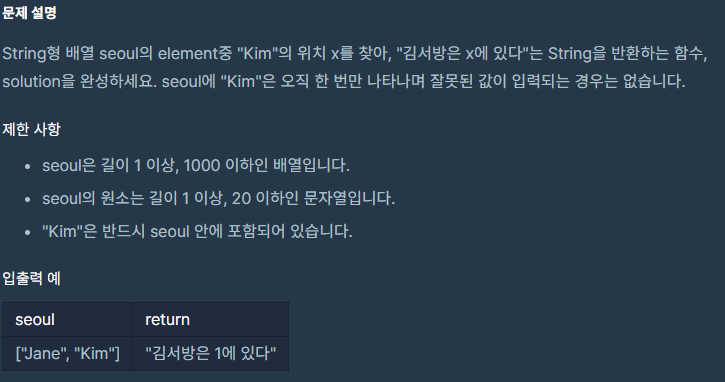 String형 배열 seoul의 element중 "Kim"의 위치 x를 찾아, "김서방은 x에 있다"는 String을 반환하는 함수, solution을 완성하세요. seoul에 "Kim"은 오직 한 번만 나타나며 잘못된 값이 입력되는 경우는 없습니