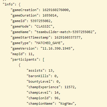 해당 게임의 클라이언트 버전, 게임 맵, 10명의 챔피언과 룬,특성, 아이템 등등 정말 많은 데이터가 담겨져 있다.