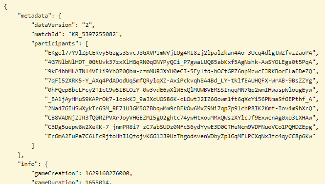 이렇게 받아온 매치아이디를 match-v5에 넣게되면 인게임 정보가 호출 된다.