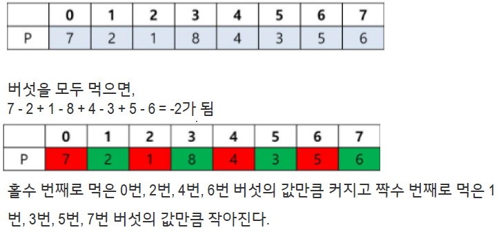 4. 즉, 홀수번째로먹은버섯의숫자만큼커지고짝수번째로먹은숫자만큼작아짐