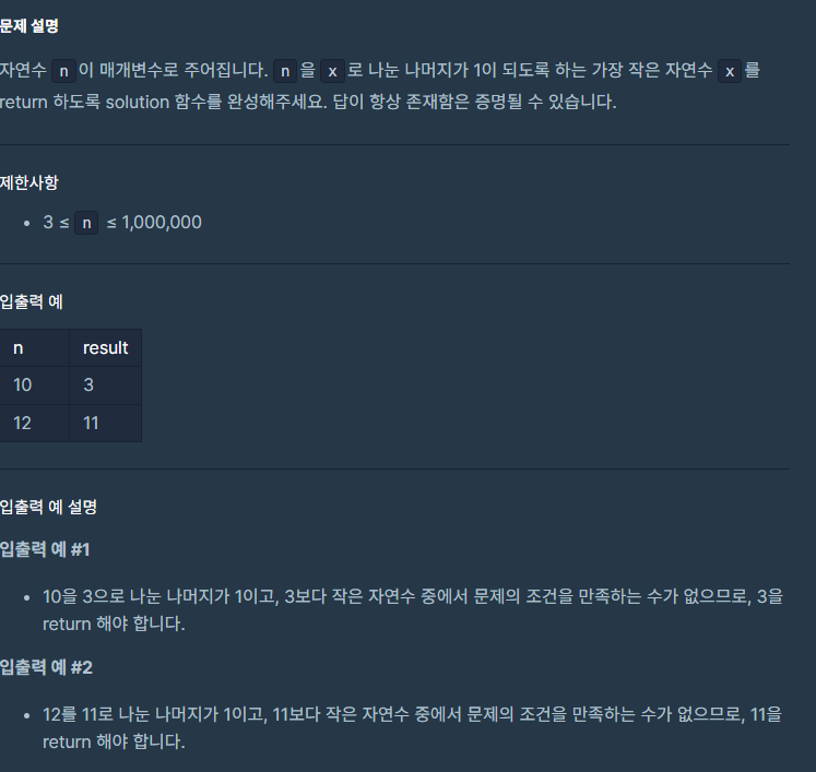 자연수 n이 매개변수로 주어집니다. n을 x로 나눈 나머지가 1이 되도록 하는 가장 작은 자연수 x를 return 하도록 solution 함수를 완성해주세요. 답이 항상 존재함은 증명될 수 있습니다. 제한사항 입