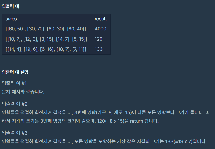 그래서 한 명함의 크기를 가로를 크게, 세로를 작게 소팅하여 정리해준다음에 가로에서 최대값과 세로에서 최대값을 구하면 될 것이라고 생각해서 코드를 짰다.