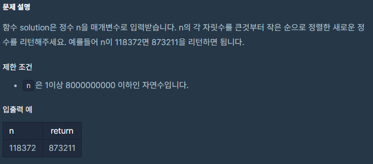 함수 solution은 정수 n을 매개변수로 입력받습니다. n의 각 자릿수를 큰것부터 작은 순으로 정렬한 새로운 정수를 리턴해주세요. 예를들어 n이 118372면 873211을 리턴하면 됩니다. 제한 조건 n은 1이
