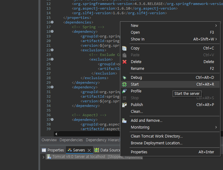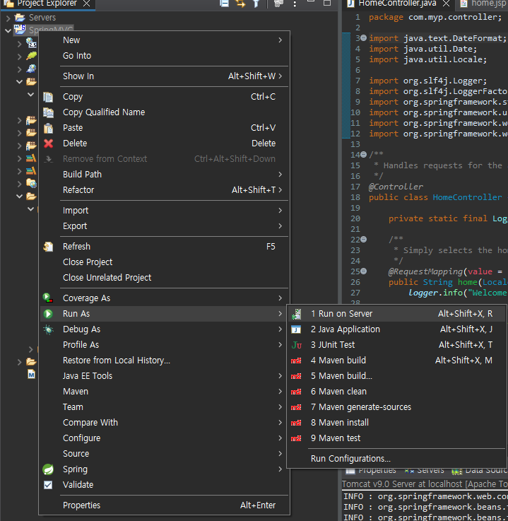 프로젝트 우클릭 -> Run As -> Run on server
