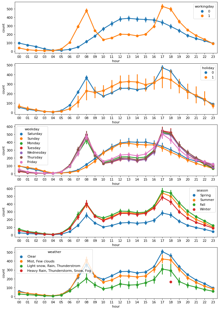 # 근무일, 공휴일, 요일, 계절, 날씨에 따른 시간대별 평균 대여 수량 포인트플롯