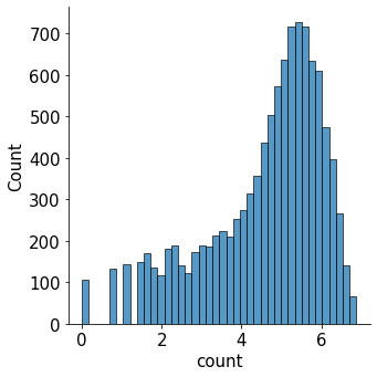 이렇게 왼쪽 편향이 되어있을 때는 로그변환을 해주면 좋다.