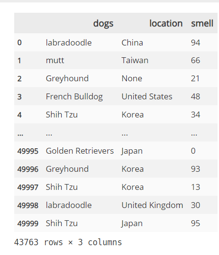 columns = ['dogs','location','smell'])먼저 가짜 데이터를 만들어줍니다. 50,000개의 데이터프레임이 있다고 가정하겠습니다. dogs에는 None을 통해 결측치를 집어넣어 주었습니다.