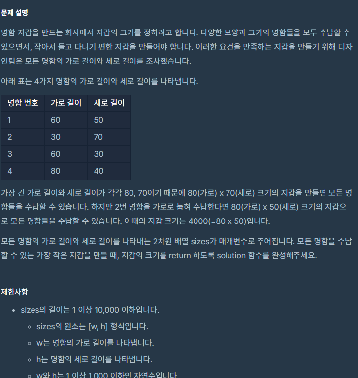 문제링크 : https://programmers.co.kr/learn/courses/30/lessons/86491 코딩테스트 연습 - 최소직사각형 [[10, 7], [12, 3], [8, 15], [14, 7], [5, 15]] 120 [[14, 4], [19, 6], [6, 16], [18, 7], [7, 11]] 133 programmers.co.kr 문제는 이해하기 쉬웠다. 그래서 한 명함의 크기를 가로를 크게, 세로를 작게 소팅하여 정리해준다음에 가로에서 최대값과 세로에서 최대값을 구하면 될 것이라고 생각해서 코드를 짰다. def solution(sizes): resizes = [] for i in range(len(sizes)): resizes.append(sorted(sizes[i], reve..